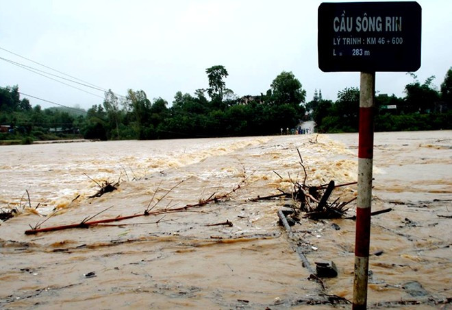Cầu Sông Rinh bị ngập, giao thông tê liệt.