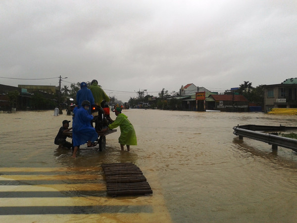 TPO - Chiều 16/11, trời vẫn mưa, nước lũ cuồn cuộn đổ về khiến người dân Quảng Nam hoảng hốt. Quốc lộ 1A đoạn qua thị trấn Nam Phước (Duy Xuyên) đến Quế Sơn bị tắc nghẽn. Cuộc sống người dân đảo lộn.