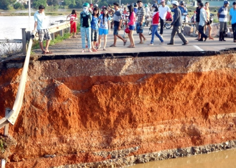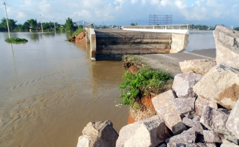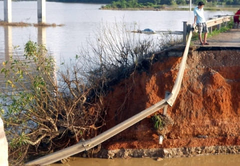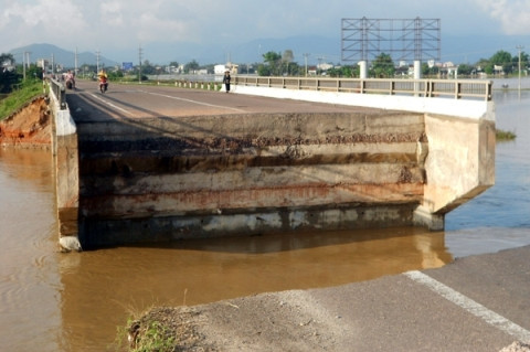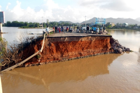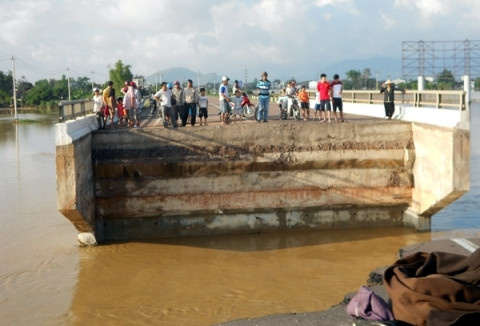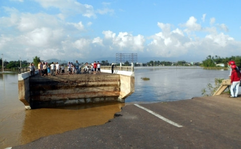 Hình ảnh cây cầu bị nước lũ cuốn trôi nhịp dài 20m tại thị xã An Nhơn (Bình Định), gây tê liệt giao thông trên tuyến QL 1A.