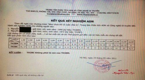 Bản kết quả ADN mà ông Triển đưa trên website đúng là do TT ADN của bà Nguyễn Thị Nga cung cấp về trường hợp anh Nguyễn Hữu Thành và bà Nguyễn Thị Nguyệt. Ngày ký: 24/5/2011, tức là 3 năm 3 tháng sau cuộc đoàn tụ.