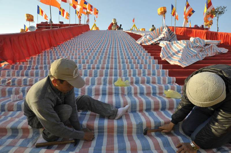 6h sáng mai, sau lễ khai quang yên vị, tấm vải lụa khổng lồ bao trùm bức tượng đồng nặng 138 tấn sẽ được hạ xuống để cho mọi người chiêm bái.