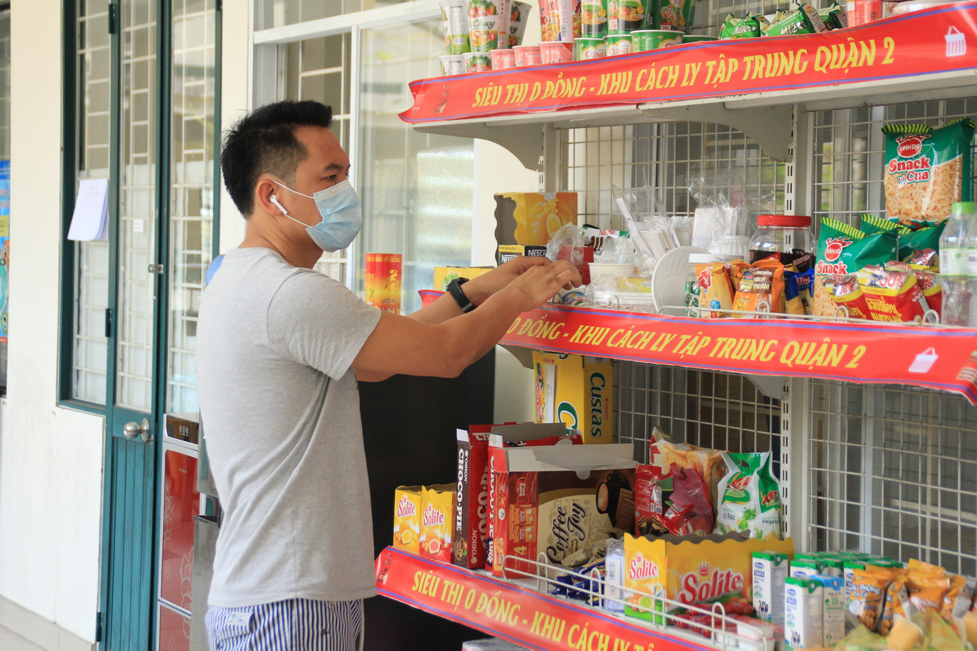 Siêu thị mini này được đặt bên trong trung tâm cách ly tập trung Quận 2 (đường Nguyễn Thị Định, phường Cát Lái, quận 2). Vừa đi vào hoạt động từ ngày 21/3, gian hàng này cung cấp khá đầy đủ những mặt hàng tiêu dùng thiết yếu hàng ngày như bánh ngọt, mỳ, nước suối, khăn giấy, bàn chải, kem đánh răng, sữa tắm... để những người thực hiện cách ly có thể tự nhiên, thoải mái sử dụng khi cần.