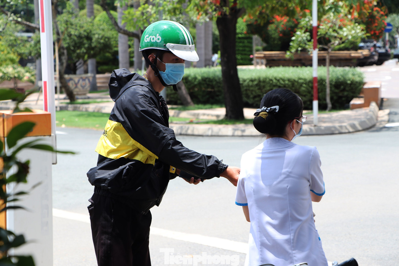 Nhiều nhân viên của bệnh viện đặt đồ ăn từ bên ngoài phải ra tận cổng để nhận thực phẩm do người ngoài không được vào trong khuôn viên bệnh viện.