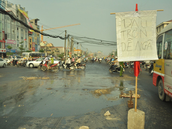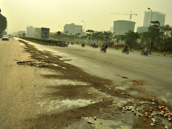 Cả đoạn đường dài hơn 1km bị phủ lớp dầu bôi trơn, khiến nhiều người dân đi đường bị ngã xe.
