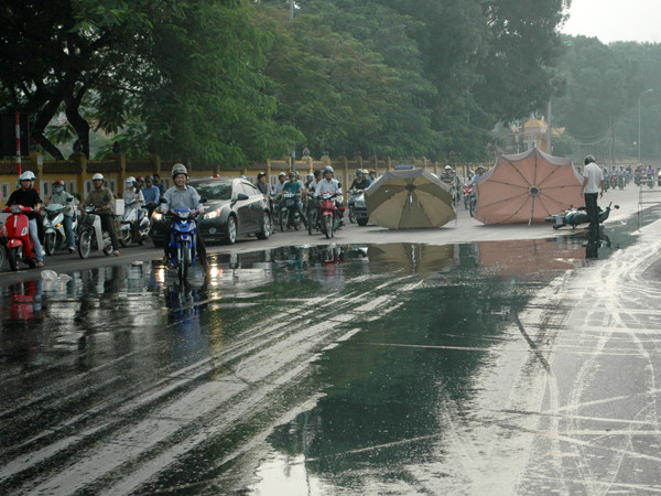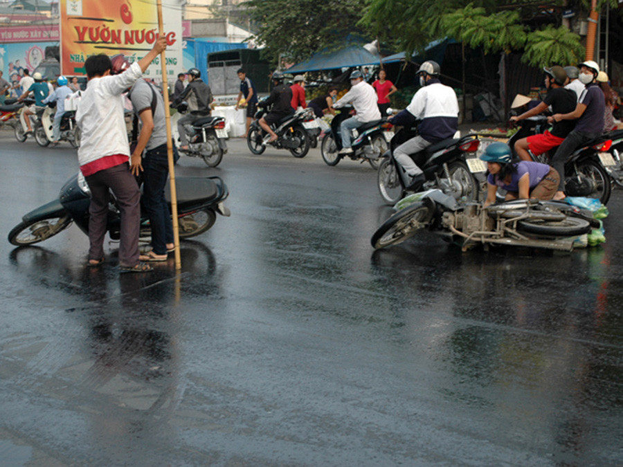 | Nhiều người trượt ngã vì đường dính dầu. |