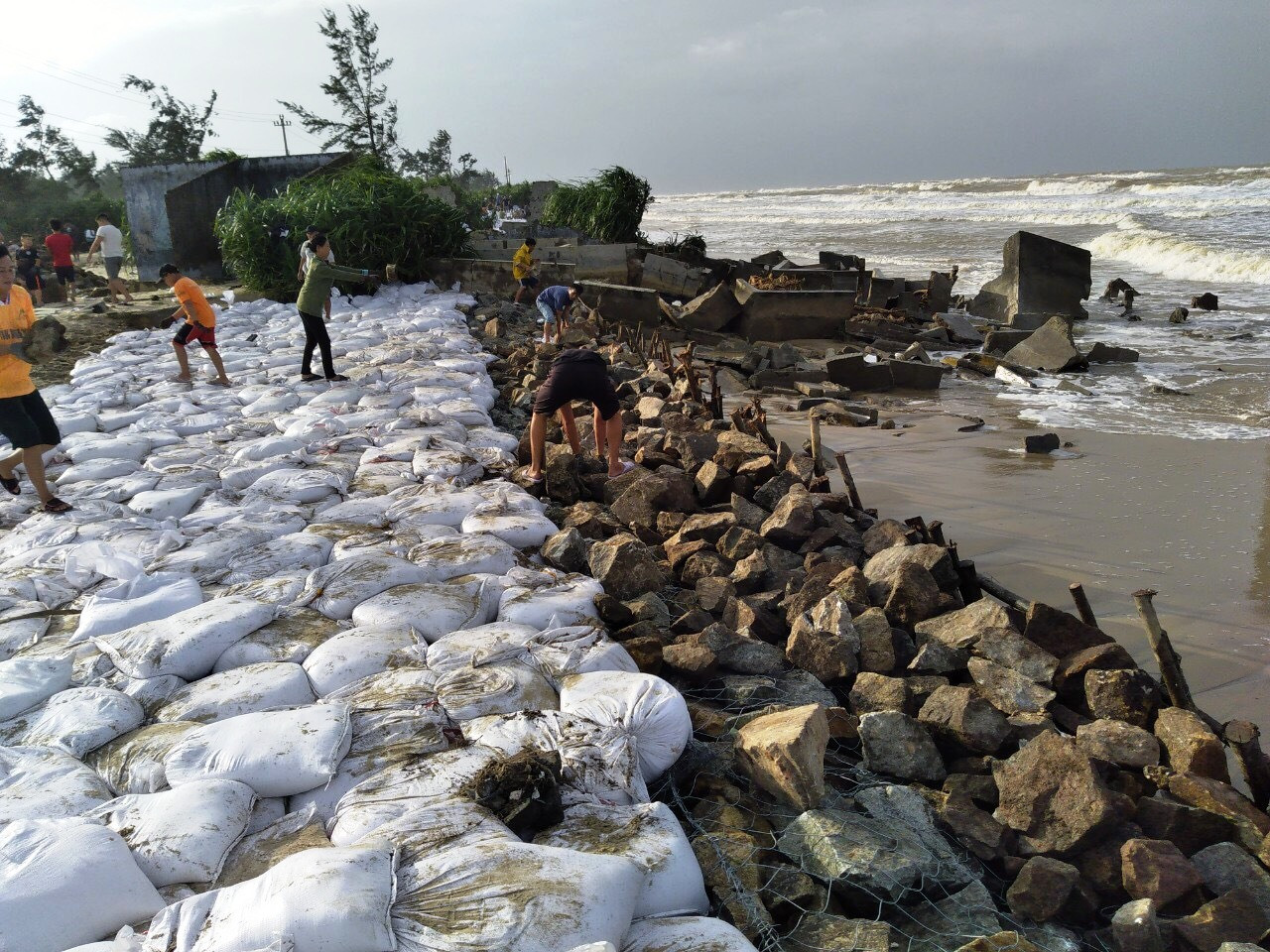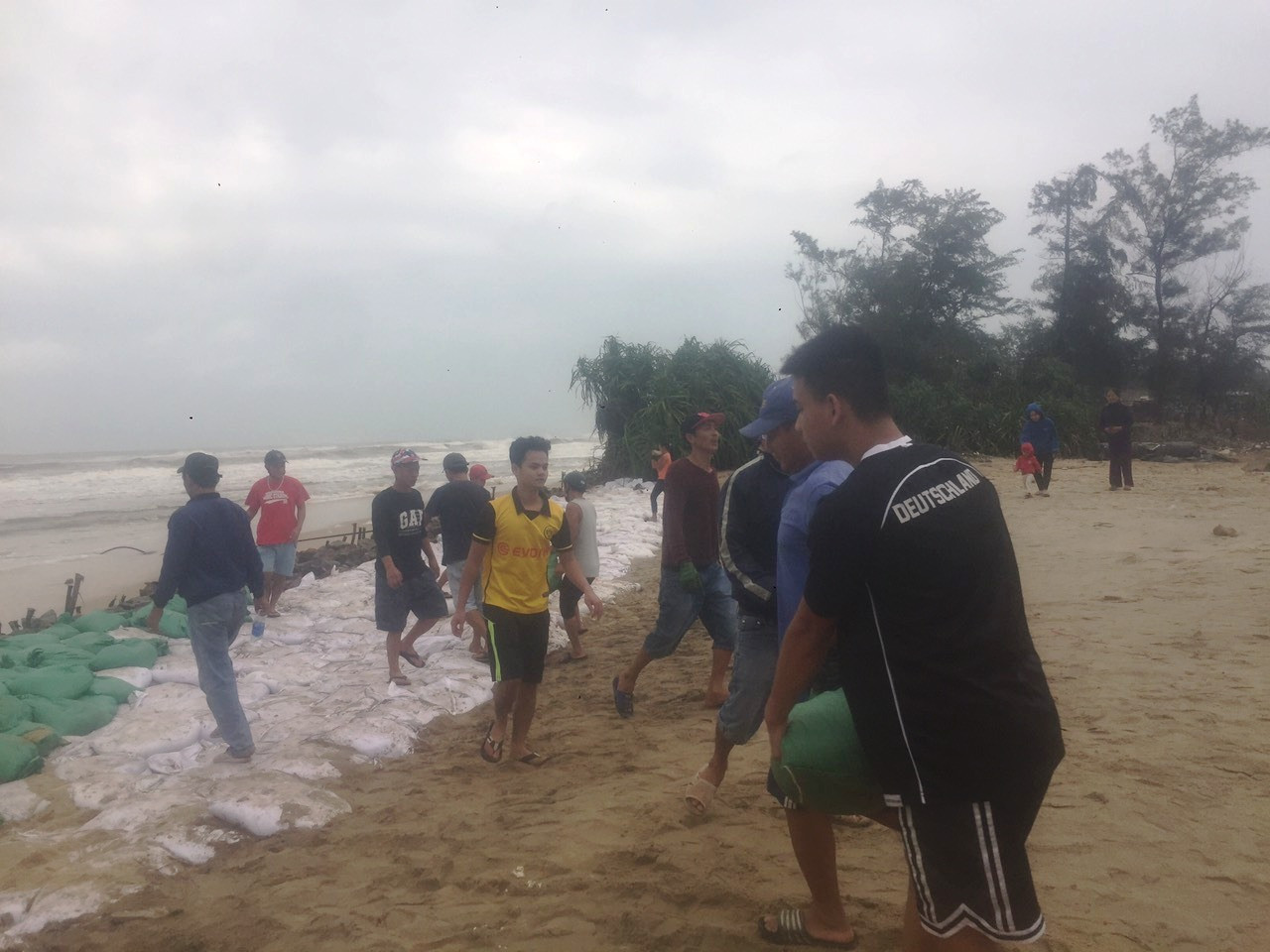 Tại xã ven biển Phú Thuận (huyện Phú Vang), trong sáng 14/11, bên cạnh khẩn trương di dân đến nơi an toàn, lực lượng chức năng địa phương còn tập trung xử lý các điểm bờ biển bị sóng lớn xâm thực sâu vào đất liền.