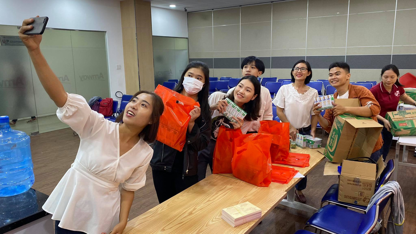 Những bạn trẻ vui vẻ nhận phần quà nhỏ của ban tổ chức sau khi hiến máu.