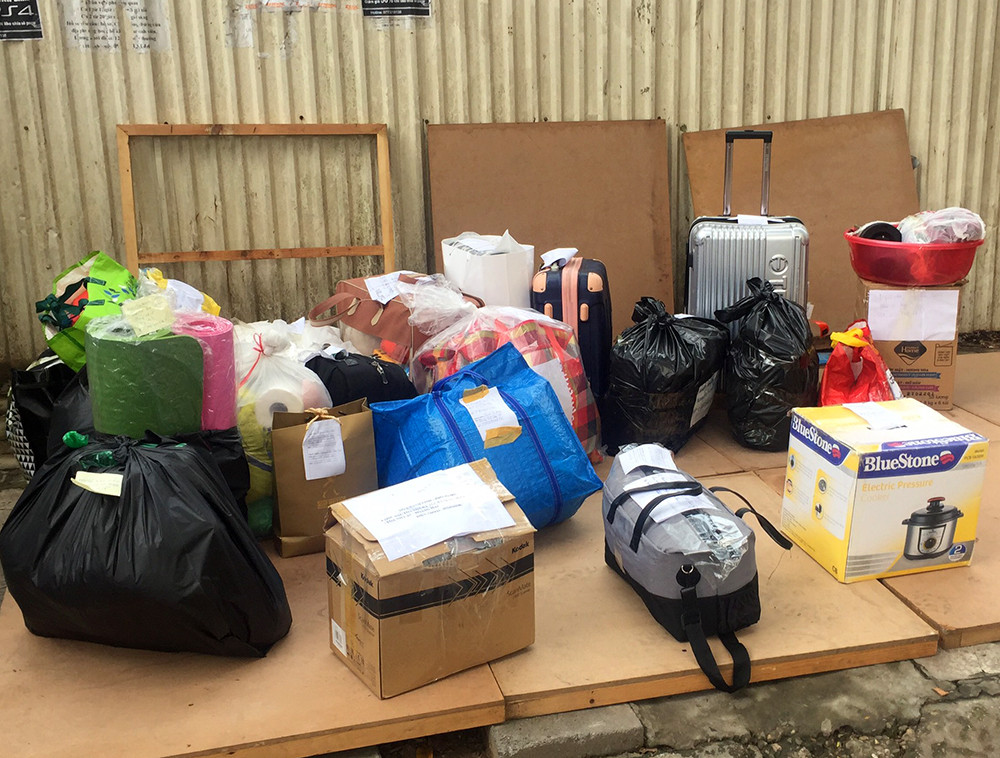 Những nhu yếu phẩm được thân nhân của người được cách ly gửi tập trung bên ngoài được ghi kèm thông tin tên, số điện thoại, số phòng, số tầng để lực lượng chức năng chuyển vào bên trong
