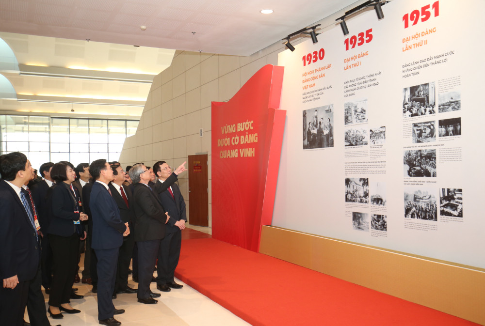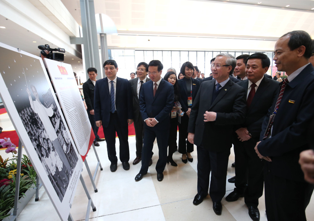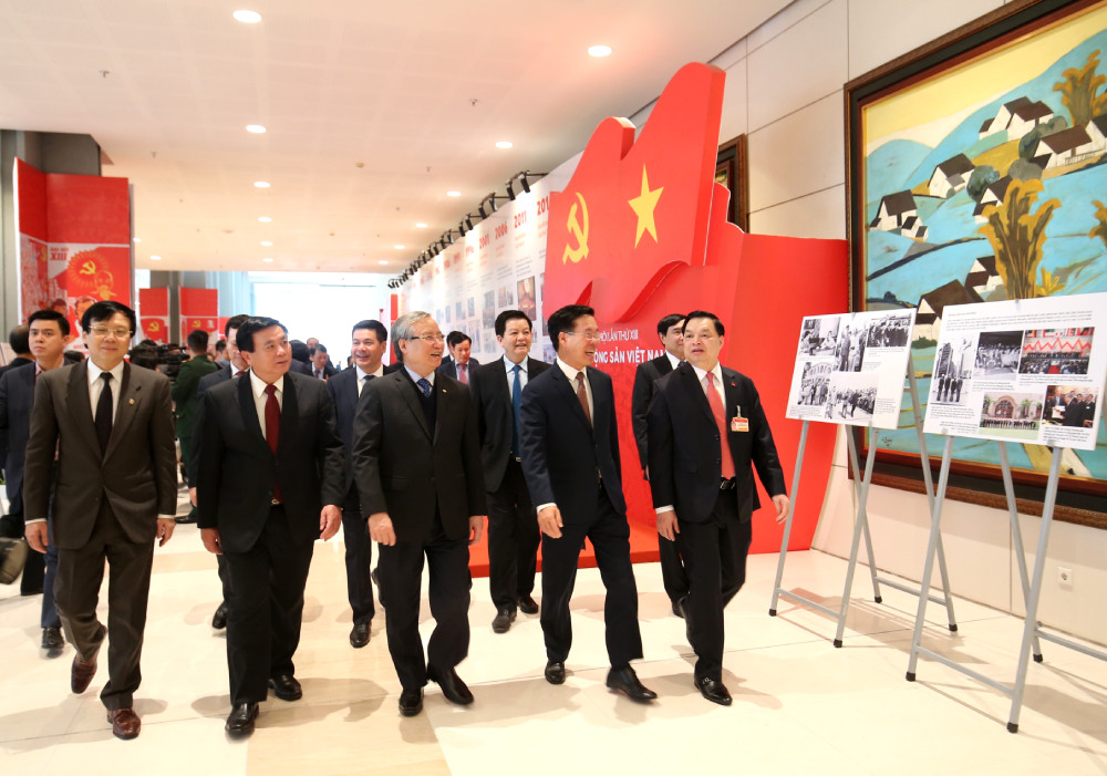Thường trực Ban Bí thư Trần Quốc Vượng, Trưởng Ban Tuyên giáo Trung ương Võ Văn Thưởng và đại biểu tham quan khu vực trưng bày ảnh "Vững bước dưới cờ Đảng quang vinh" do Ban Tuyên giáo Trung ương và Thông tấn xã Việt Nam tổ chức.