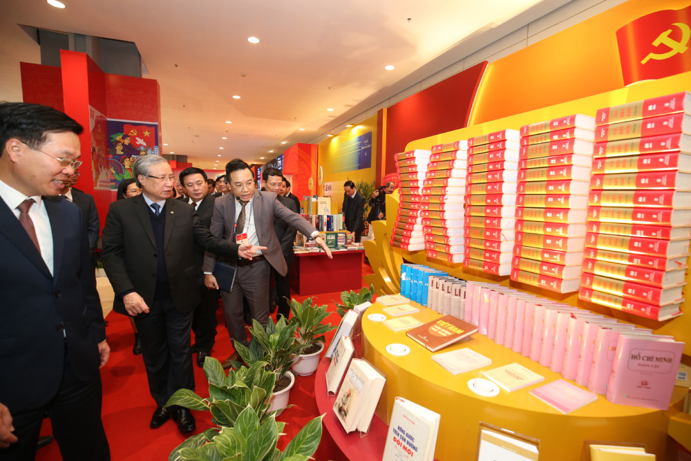 Đồng chí Trần Quốc Vượng, Ủy viên Bộ Chính trị, Thường trực Ban Bí thư; đồng chí Võ Văn Thưởng, Ủy viên Bộ Chính trị, Bí thư Trung ương Đảng, Trưởng ban Tuyên giáo Trung ương và đại biểu tham quan khu vực Trưng bày sách, báo tại Trung tâm Hội nghị quốc gia.