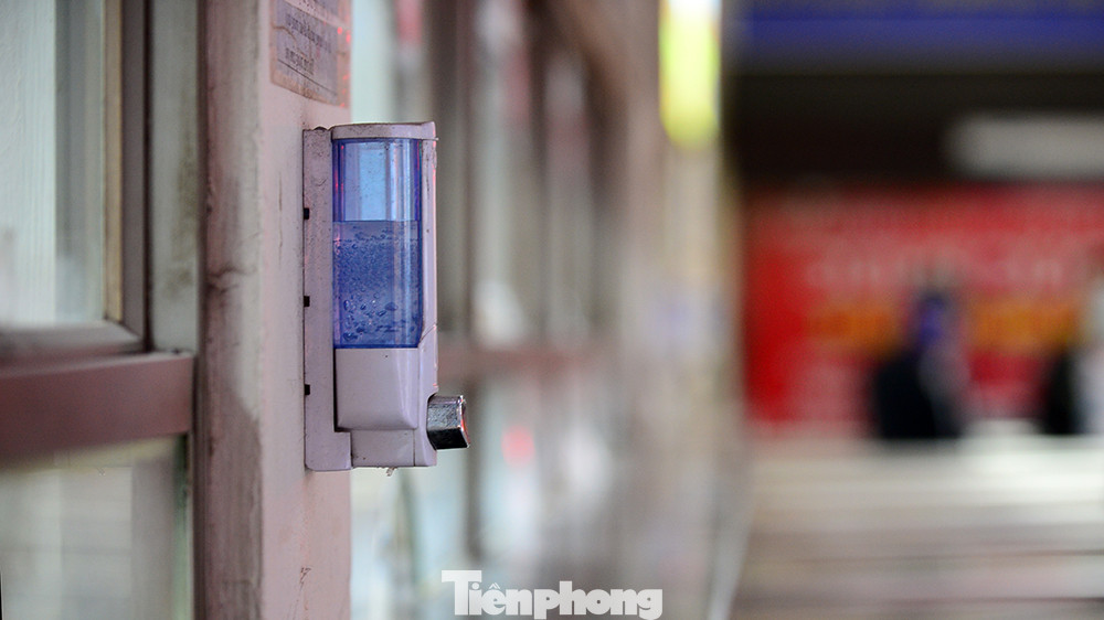 Phía trong bến xe, nước sát khuẩn được lắp đặt khắp nơi phục vụ hành khách.
