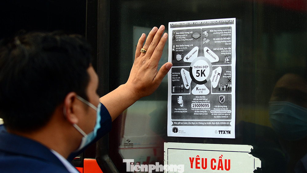 Thông điệp 5K và số điện thoại cần thiết để khai báo y tế được các nhà xe dán ngay cửa lên xuống xe.