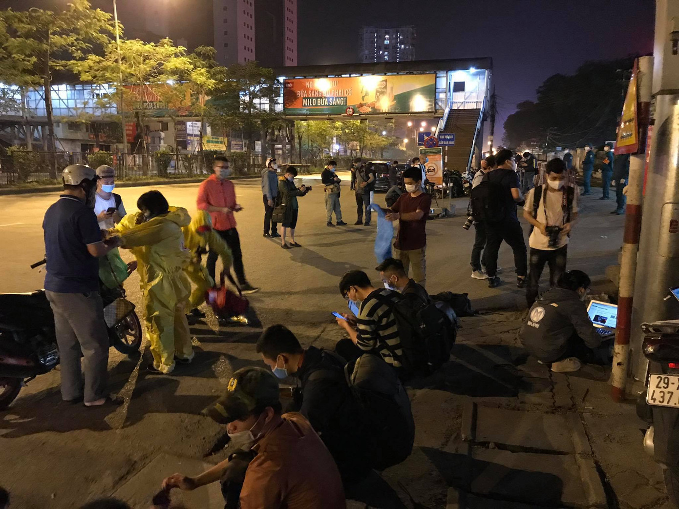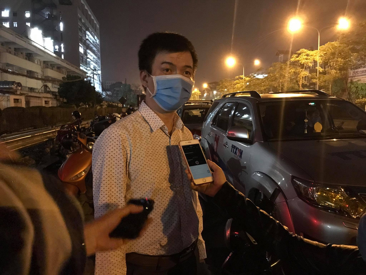 Anh Nguyễn Quốc Hưng (trú tại phường Mai Dịch, quận Cầu Giấy) cầm theo một chiếc áo khoác mỏng đến đón vợ trong đêm. Vợ anh công tác tại Khoa Kiểm soát nhiễm khuẩn.