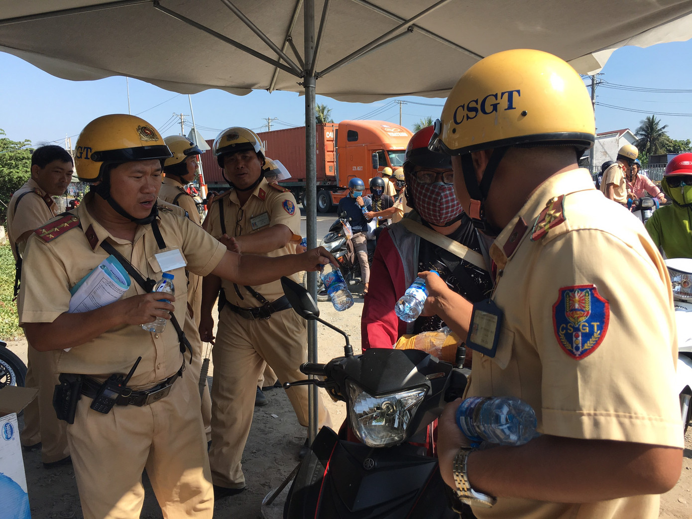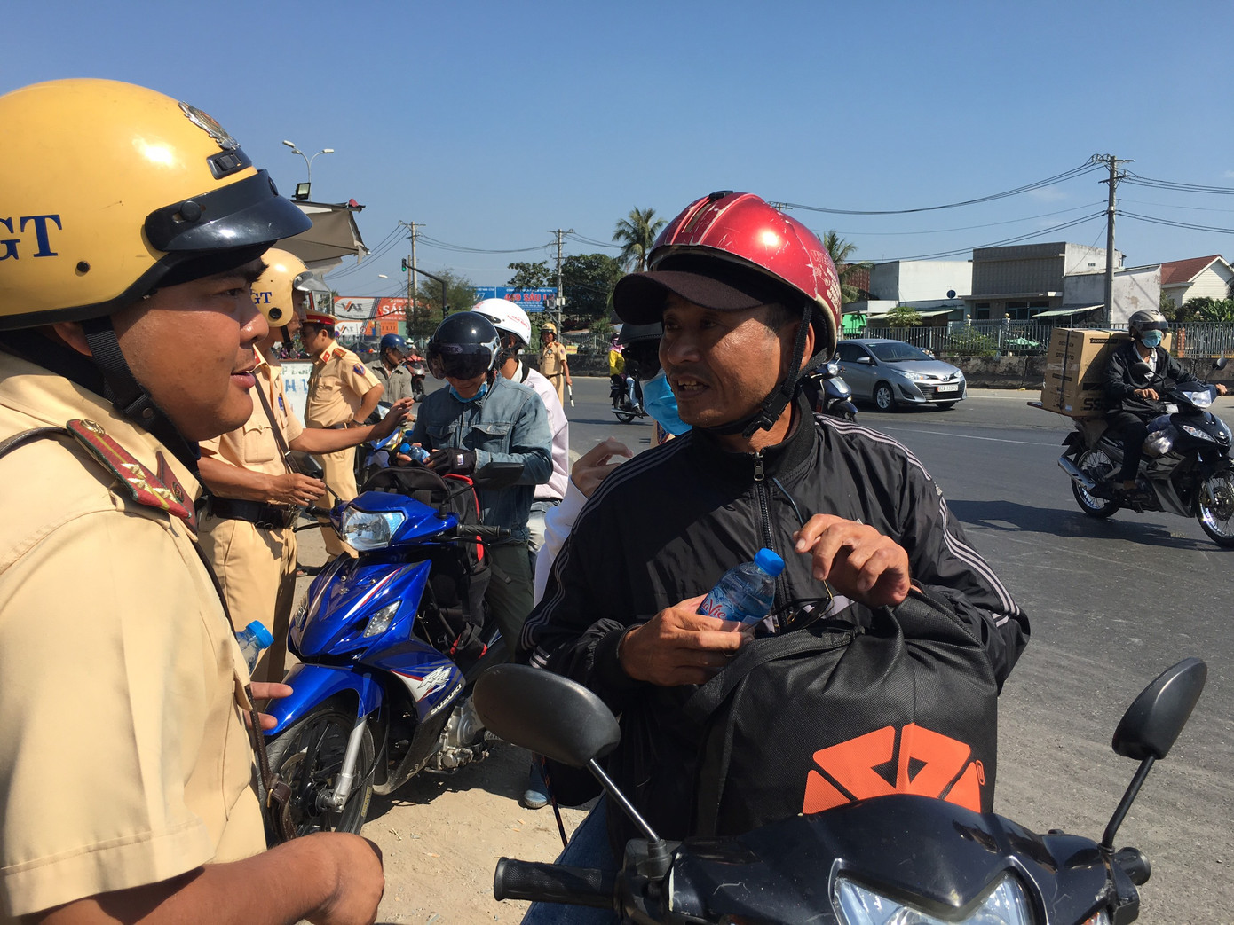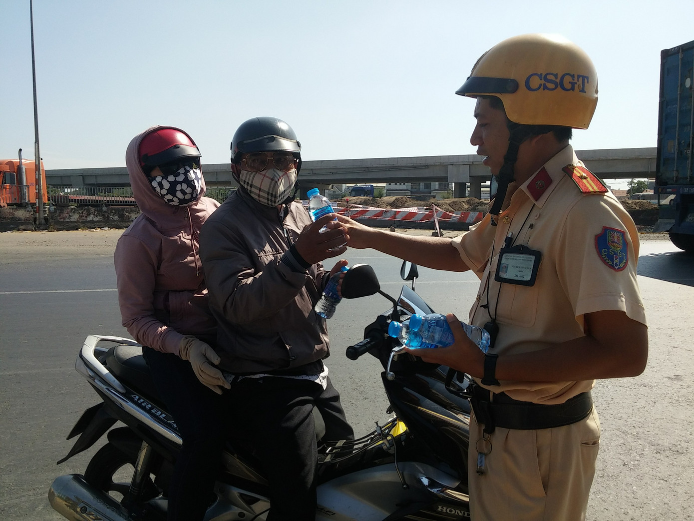 Sau khi tuyên truyền nhắc nhở, CSGT sẽ tặng cho người người đi đường những chai nước suối và khăn lạnh để giải khát và làm giảm bớt căng thẳng và mệt mỏi trên đường.