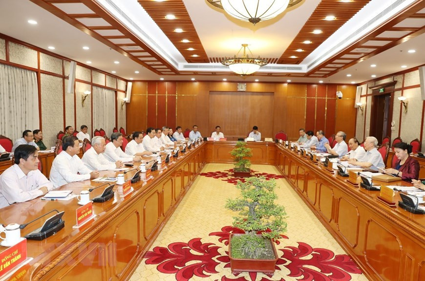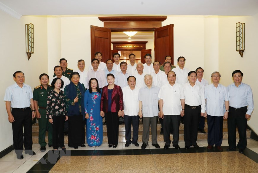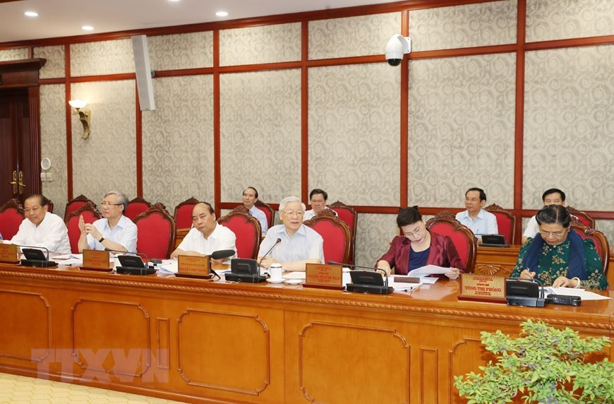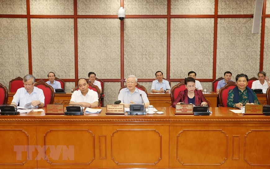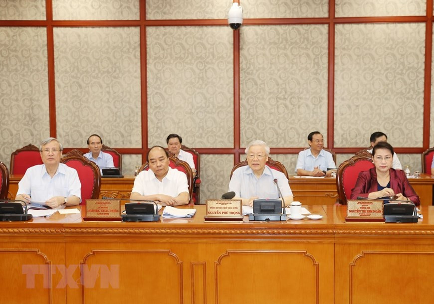 Tham dự cuộc họp còn các Ủy viên Bộ Chính trị như Thủ tướng Nguyễn Xuân Phúc, Chủ tịch Quốc hội Nguyễn Thị Kim Ngân, Thường trực Ban Bí thư Trần Quốc Vượng, Phó Chủ tịch Quốc hội Tòng Thị Phóng. (Ảnh: Trí Dũng/TTXVN)