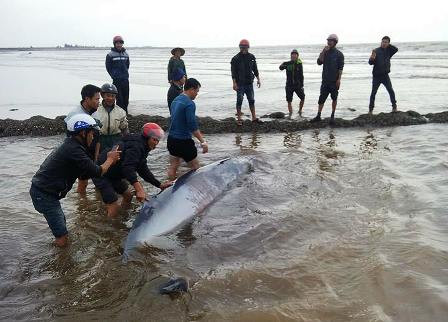 Theo một số người dân cho biết, vào khoảng thời gian trên, một số diêm dân trong quá trình đi làm muối thì phát hiện một vật thế lạ nằm sát bờ biển. Chạy lại kiểm tra thì nhiều người mới biết đây là một con cá voi đang còn sống dài hơn 5 mét nặng khoảng 3 tấn đang bị mắc cạn.