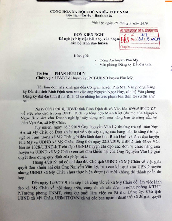 Theo đó, đơn đề nghị xử lý việc bị bôi nhọ, xúc phạm trên Facebook do chính ông Phan Hữu Duy - Phó Chủ tịch UBND huyện Phù Mỹ (Bình Định) viết gửi đến Công an huyện Phù Mỹ, Văn phòng Đăng ký đất đai tỉnh.