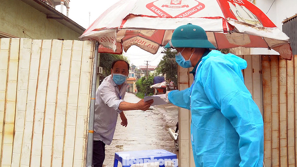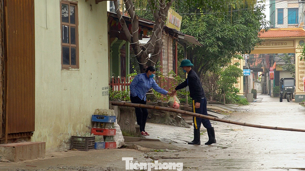 Đo thân nhiệt những người dân ra khu vực nhận đồ "tiếp tế" từ bên ngoài.