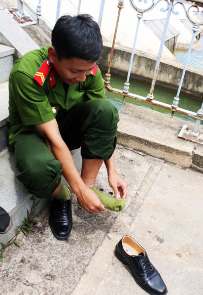 Vì vội cứu người nên anh Vũ mặc nguyên chiếc quần quân phục, trong đó có điện thoại iPhone 5 nhảy xuống hồ. Cứu được người rồi thì điện thoại ngấm nước, không hoạt động được nữa.