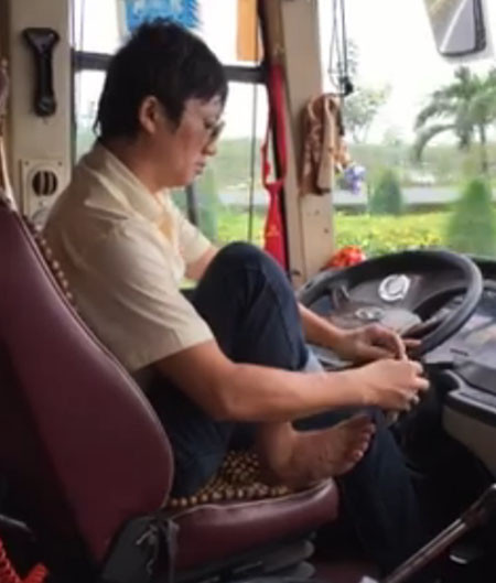 Đoạn video có cảnh tài xế buông vôlăng hơn một phút để mang giày được quay ngày 16/6 trên chuyến xe Quy Nhơn - Vũng Tàu, được cho có khoảng 40 hành khách. Trong tiếng nhạc sôi động, lái xe đeo kính râm gác hẳn chân trái lên bảng táp-lô, tay phải vòng qua khe vôlăng để thắt dây giày trong khi xe lao vun vút.