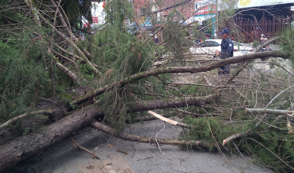 Một cây tùng cổ thụ khoảng 60 năm tuổi trên đường Yersin (phường 10) bị gió quật ngã, đổ ập vào một cửa hàng chuyên kinh doanh gas nhưng may mắn không có trường hợp thương vong nào.