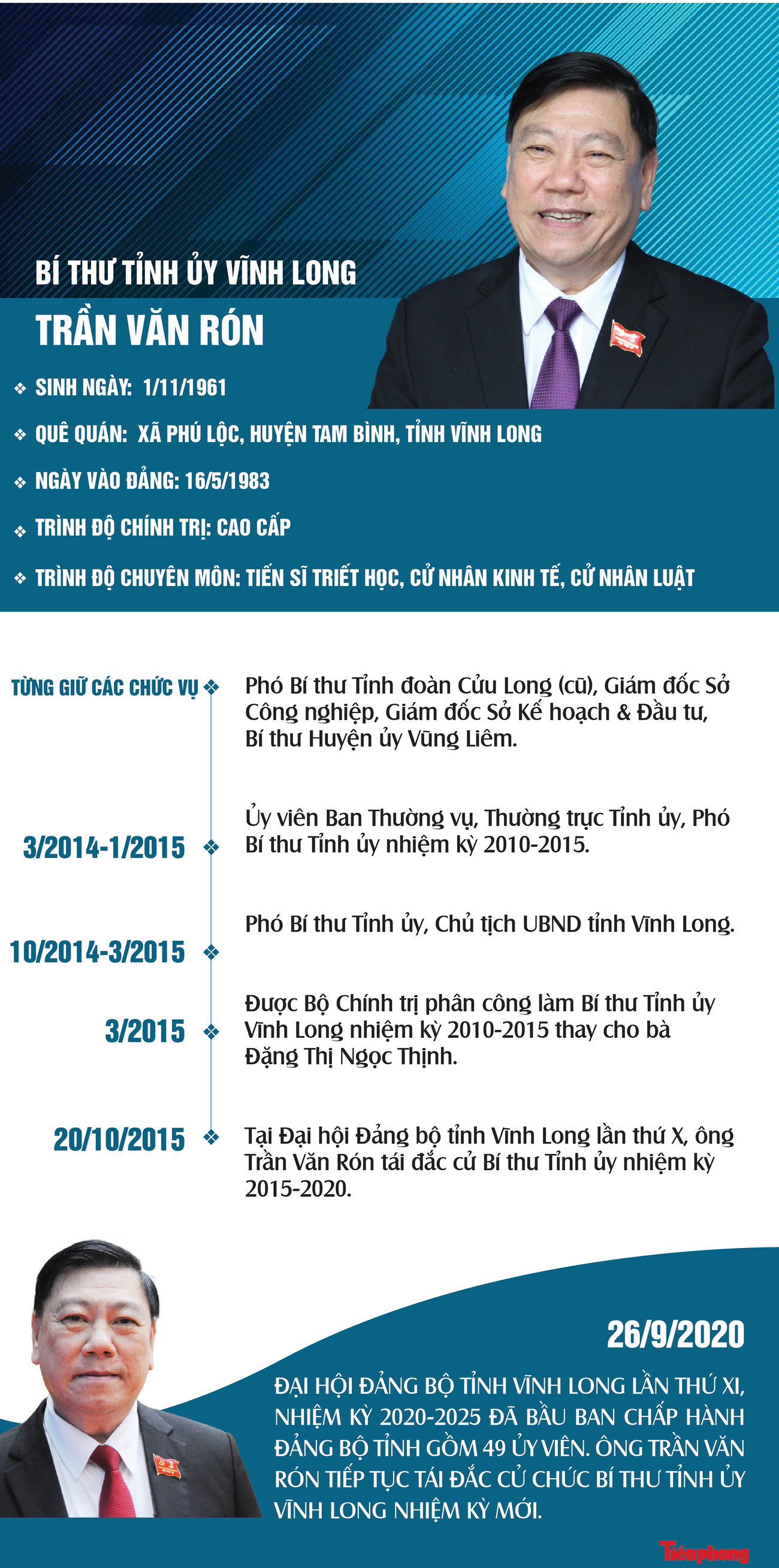 Đại hội Đảng bộ tỉnh Vĩnh Long lần thứ XI, nhiệm kỳ 2020-2025 đã bầu Ban Chấp hành Đảng bộ tỉnh gồm 49 ủy viên. Ông Trần Văn Rón tiếp tục tái đắc cử chức Bí thư Tỉnh ủy Vĩnh Long nhiệm kỳ mới.