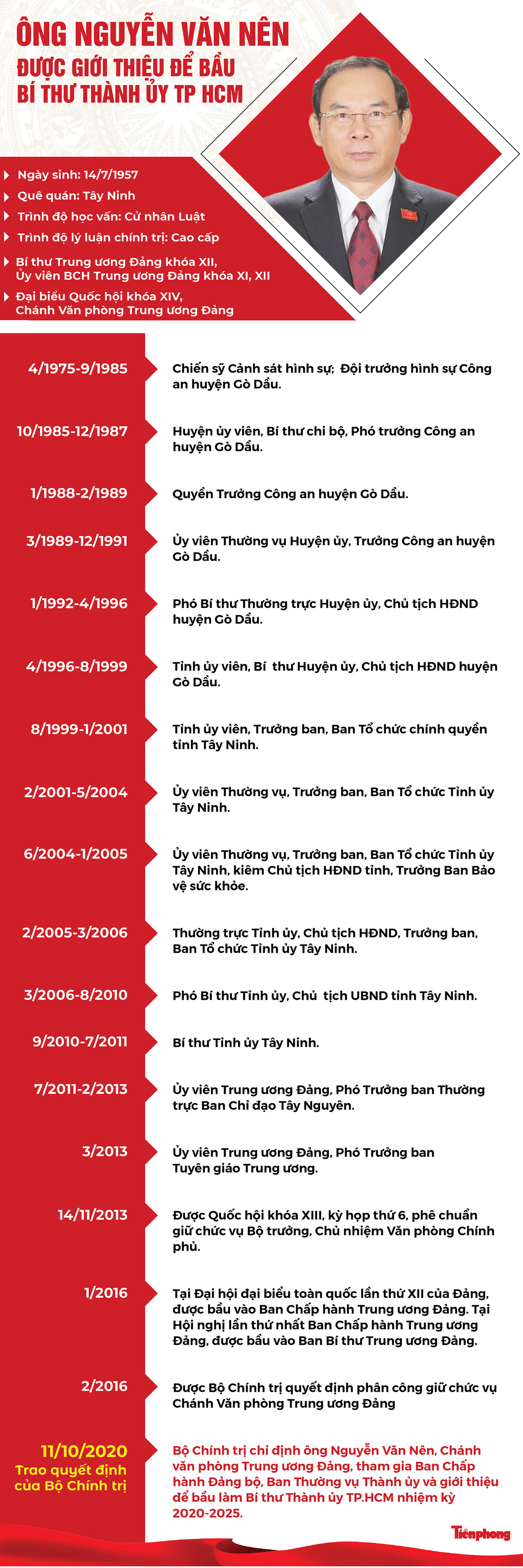 TPO - Bộ Chính trị chỉ định ông Nguyễn Văn Nên, Chánh văn phòng Trung ương Đảng, tham gia Ban Chấp hành Đảng bộ, Ban Thường vụ Thành ủy và giới thiệu để bầu làm Bí thư Thành ủy TP.HCM nhiệm kỳ 2020-2025.