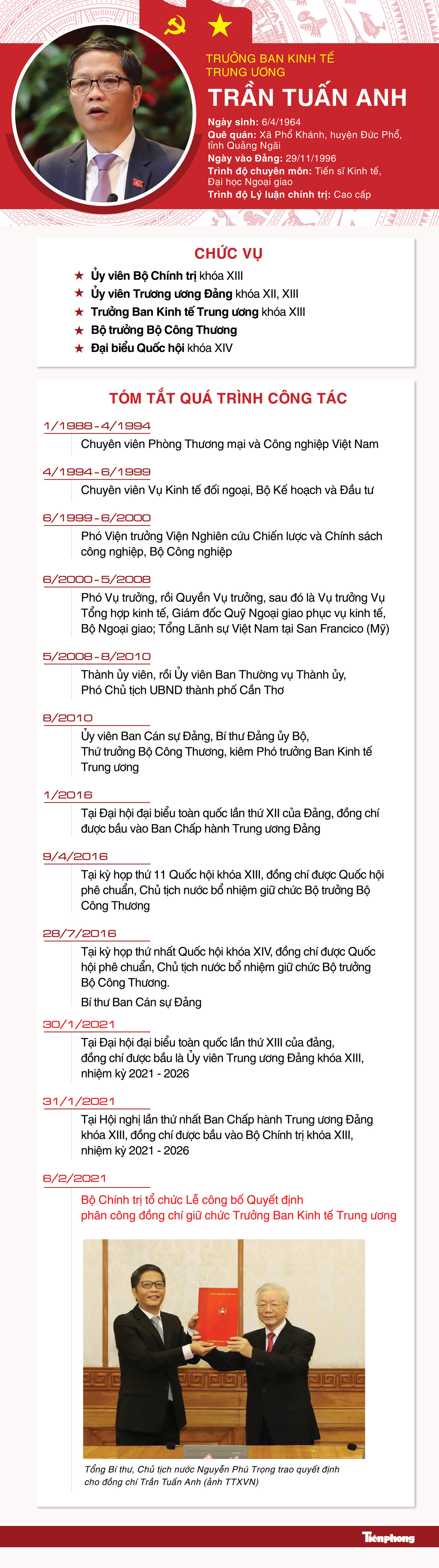 TPO - Tại Quyết định số 02-QĐNS/TW ngày 5/2/2021, Bộ Chính trị phân công đồng chí Trần Tuấn Anh, Ủy viên Bộ Chính trị, giữ chức Trưởng ban Kinh tế Trung ương.