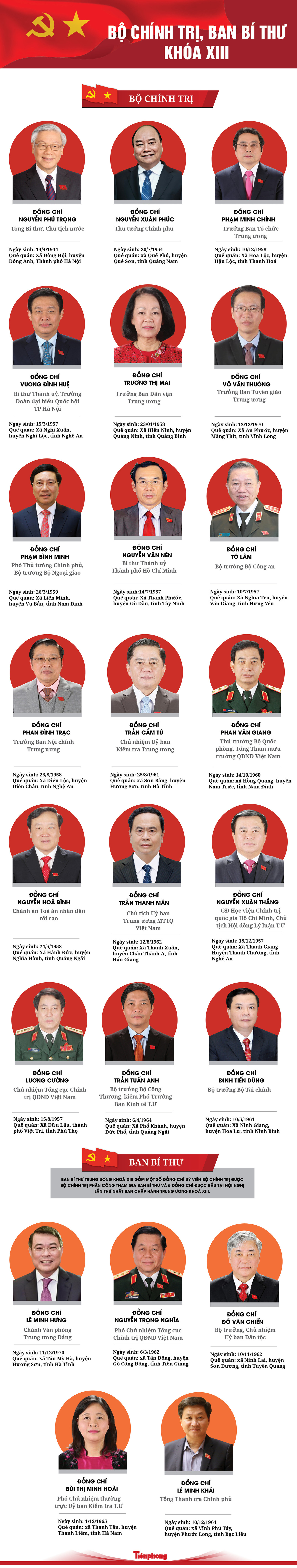 TPO - Sáng 31/1/2021, Hội nghị lần thứ nhất Ban Chấp hành Trung ương Đảng khoá XIII tiến hành phiên họp để bầu Bộ Chính trị, Tổng Bí thư, Ban Bí thư, Ủy ban Kiểm tra Trung ương Đảng, Chủ nhiệm Ủy ban Kiểm tra Trung ương Đảng. Báo Tiền Phong điện tử trân trọng giới thiệu danh sách các Ủy viên Bộ Chính trị, Ban Bí thư khóa XIII.