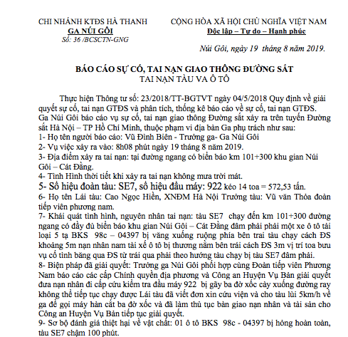 Báo cáo ban đầu của vụ việc cho biết, vào thời điểm trên, tàu khách SE7 gồm đầu máy số hiệu 922 kéo 14 toa có tổng trọng lượng 572,53 tấn) do lái tàu Cao Ngọc Hiền điều khiển chạy đến đường ngang nằm ở km 101+300 thì đâm phải phải một xe ô tô tải loại 5 tạ BKS 98C - 04397.