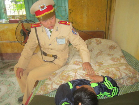Thiếu tá Âu Văn Kiện cán bộ trạm CSGT Diễn Châu người phát hiện và chăm sóc cho cháu bé cho biết: “Trong lúc tuần tra chúng tôi phát hiện cháu Trường đang nằm cuộn mình trong một bao tải xi măng. Toàn thân run lẩy bẩy, da tím tái, sức khỏe cháu rất yếu. Chúng tôi lập tức đưa cháu về trạm để chăm sóc. Sau khi ăn cháo và tắm rửa, được mặc quần áo ấm sức khỏe của cháu đã hồi phục. Có thể do bị đói, rét suốt một thời gian dài nên cháu rất yếu”.