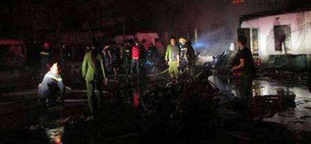 Nhiều nhân chứng tại hiện trường cho hay, chỉ ít phút sau khi phát hiện có đám khói, ngọn lửa đã bùng phát dữ dội và lan sang thiêu rụi hàng chục chiếc xe máy đang nằm trong kho.