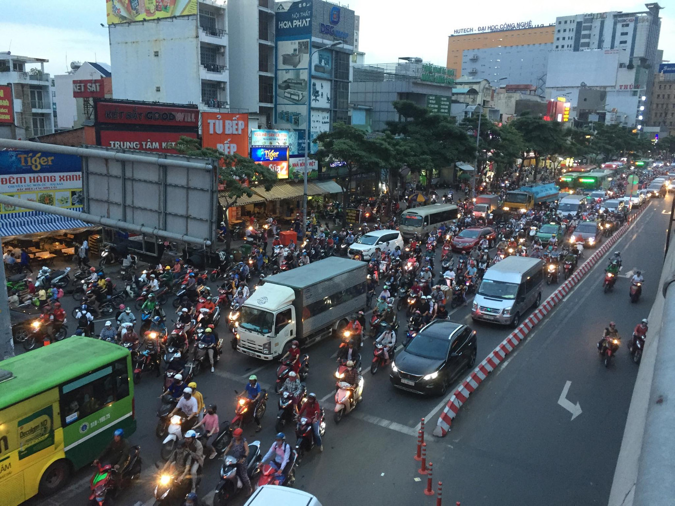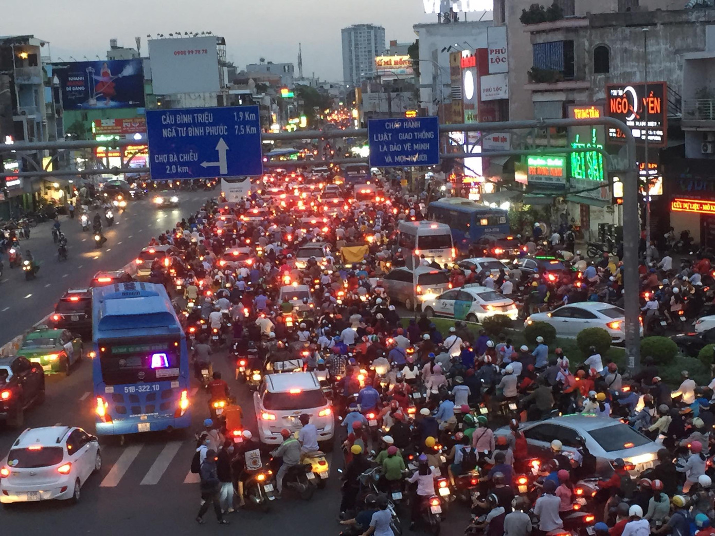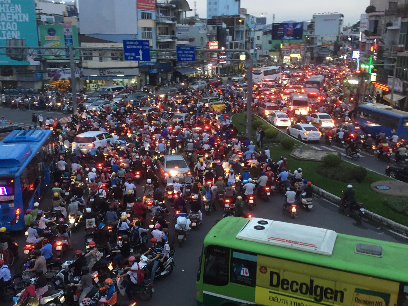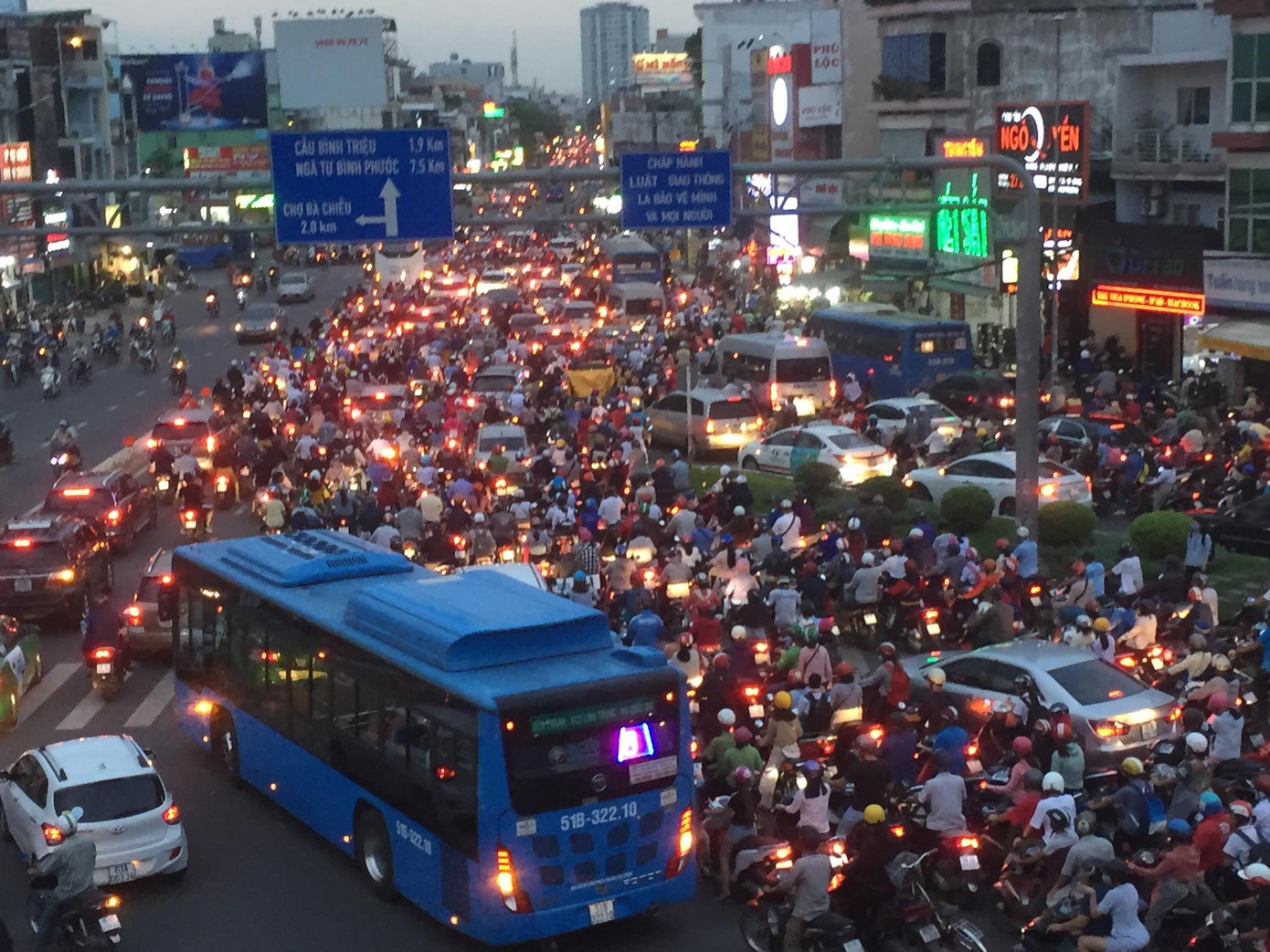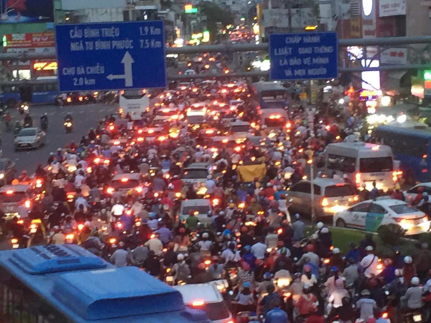 Đến hơn 18h, lượng phương tiện đổ về trung tâm TPHCM tăng cao khiến giao thông càng thêm khó khăn.