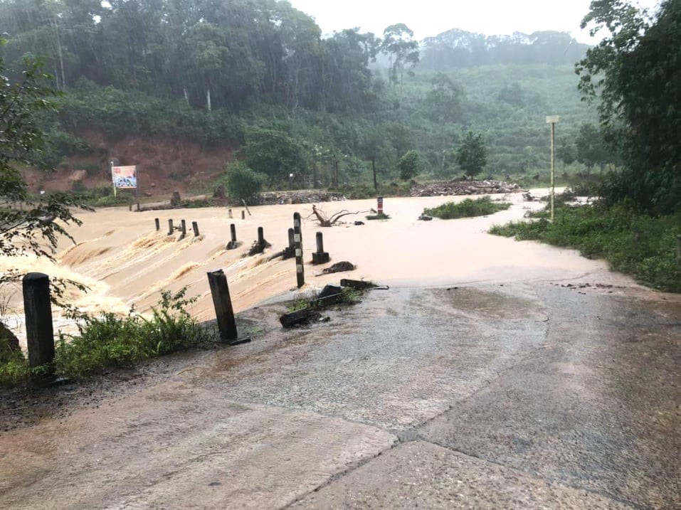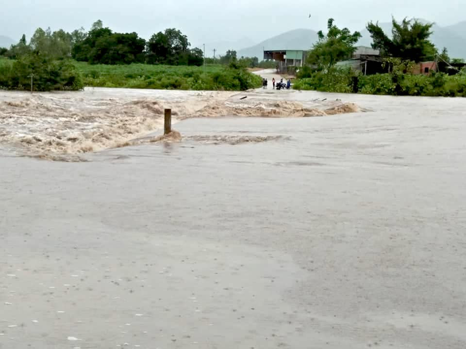 Tại Gia Lai, bão làm tường rào nhà dân ở phường Hội Phú (TP Pleiku) đổ khiến 1 người đàn ông 32 tuổi bị tử vong. Cũng tại tỉnh này, gần 200 căn nhà bị tốc mái, gần 400 ha hoa màu bị thiệt hại. Trong ảnh, nước lũ tràn qua cầu tràn ở xã Ia Rrai, huyện K rông Pa, Gia Lai