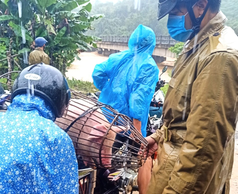 Đến chiều 28/10, bão số 9 đã gây nhiều thiệt hại trên địa bàn tỉnh Kon Tum, nặng nhất là các huyện Tu Mơ Rông, Kon Plông, Đắk Glei...Trong ảnh một hộ dân cột lợn đi sơ tán lên điểm an toàn.