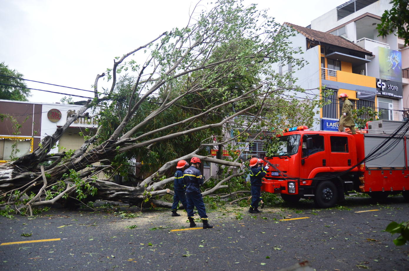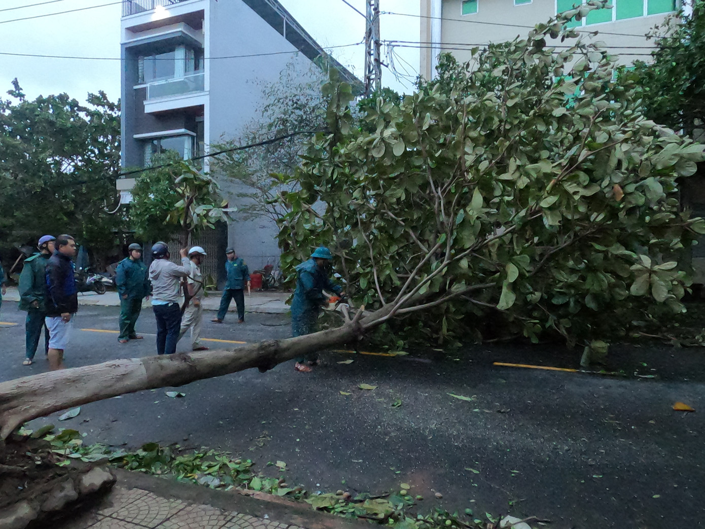 Trên các tuyến phố, cây xanh bị gió quật đổ la liệt, cản trở giao thông. Trên đường Trần Quý Cáp (quận Hải Châu), một cây xanh gãy đổ chắn ngang đường, lực lượng dân phòng và trật tự đô thị được huy động để cưa cây, giải tỏa ách tắc. Ảnh: Giang Thanh