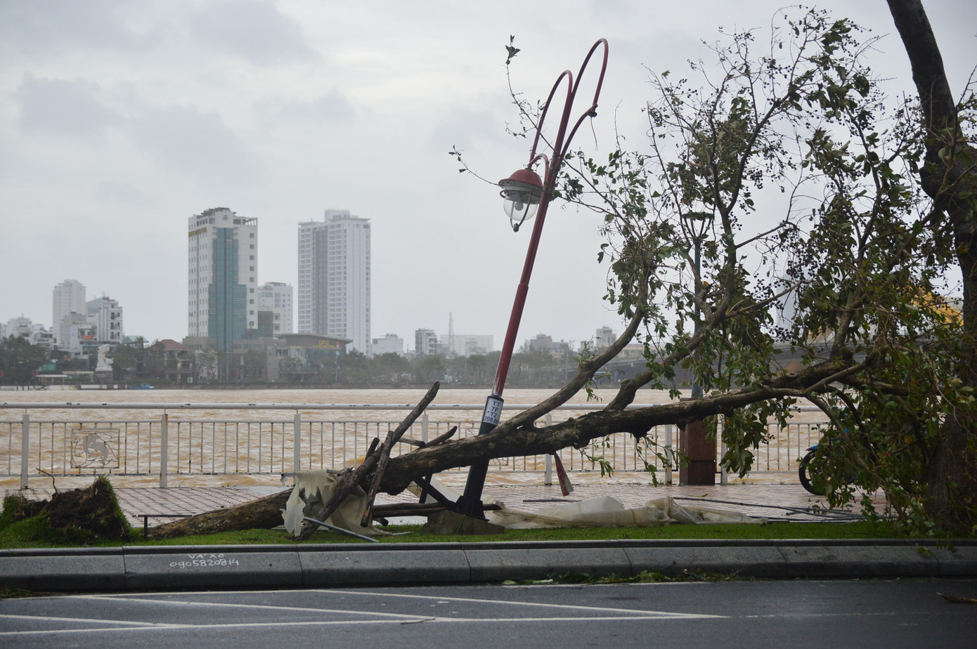 Cây xanh, cột đèn, bảng hiệu... dọc 2 bờ sông Hàn xiêu vẹo, gãy đổ vì bão Molave. Theo báo cáo nhanh của BCĐ Phòng chống thiên tai và Tìm kiếm cứu nạn TP Đà Nẵng, vì ảnh hưởng của bão số 9, nhiều trụ điện bị gãy đổ, nhiều trạm bị nổ. Hơn 240 nghìn người dân bị mất điện. Ảnh: Giang Thanh
