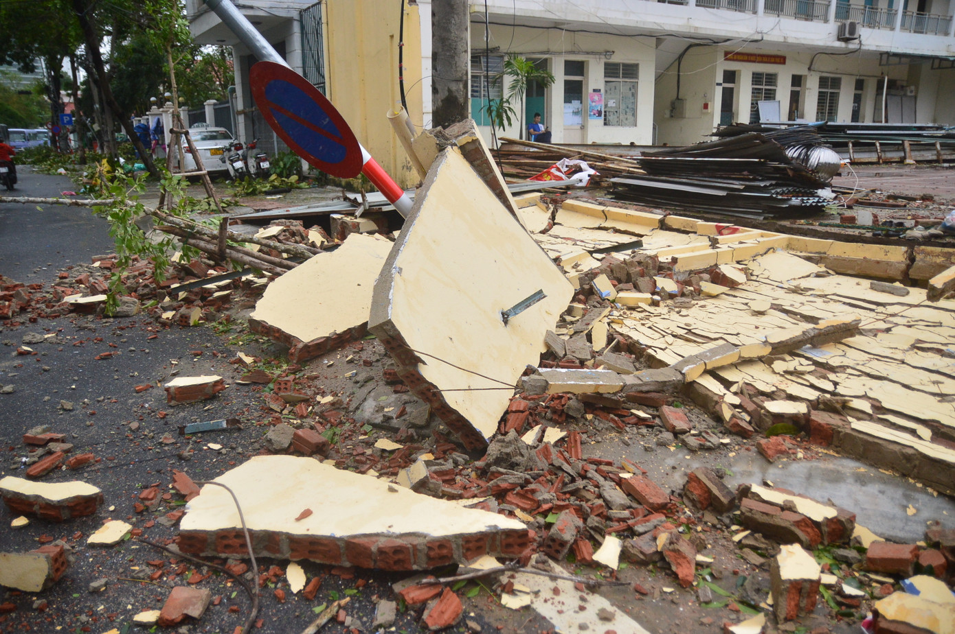 Gió lớn, giật liên tục cũng khiến nhiều mảng tường của các tòa nhà cũ bị gãy, đổ. Trong ảnh là một trụ sở trên đường Phan Đình Phùng (quận Hải Châu) bị gió đánh sập. Ảnh: Giang Thanh