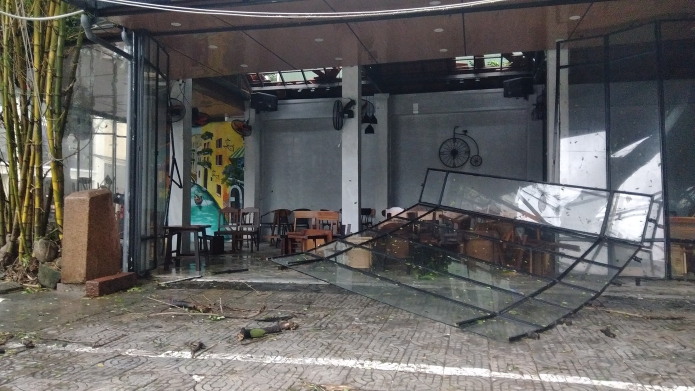 Gió tốc bay một phần mái và cửa kính của một quán cafe trên đường Lý Thường Kiệt. Ảnh: Giang Thanh