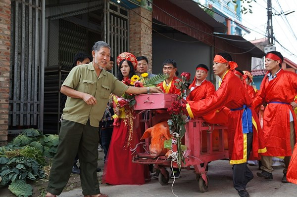 Hai ông ỉn được rước quanh làng trước khi chờ “làm cỗ”. Ảnh: Phú Xuân