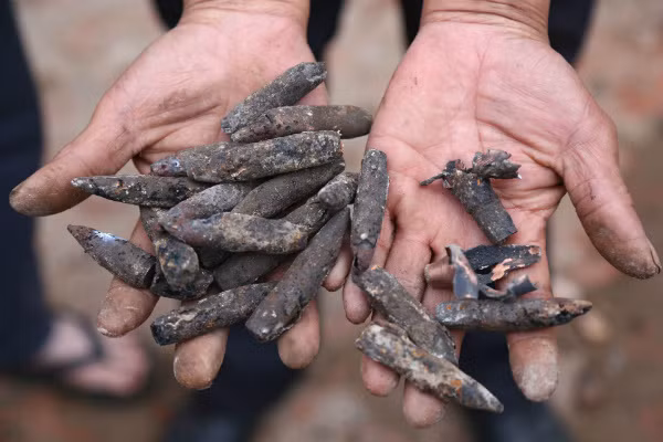 Đầu đạn bay tứ tung sau vụ nổ, được người dân gom nhặt. Ảnh: Dân trí.