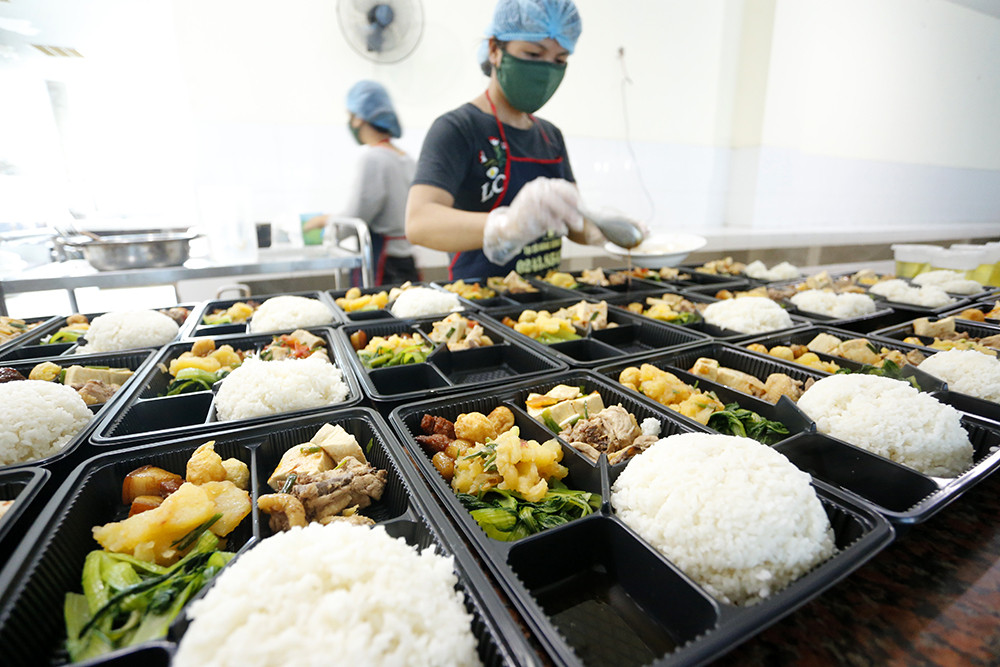 Các suất cơm nóng được cho vào khay và đóng hộp vận chuyển sang bệnh viện