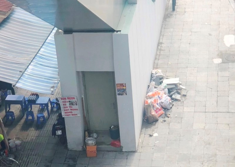 Tại nhiều cửa ra vào thang máy ở chân các ga, tình trạng lấn chiếm, đổ phế liệu diễn ra phổ biến, thậm chí tại nhà ga Vành đai 3 cửa vào thang bộ còn, buồng kỹ thuật còn là nơi đóng, treo biển quán ăn, để bếp than tổ ong.