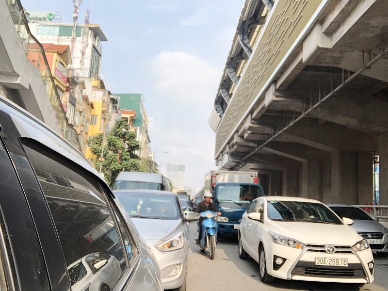 Trong khi dự án được đầu tư với trên 18.000 tỷ đồng để giảm xe cá nhân, ùn tắc cho Hà Nội đang bị “đắp chiếu”, thì các tuyến đường bên dưới vẫn quá tải về ô tô, xe máy và xe buýt phải xếp hàng đi qua các ga vì ùn tắc.