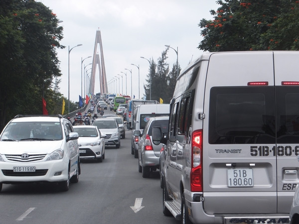 Đến 14h cùng ngày giao thông qua cầu Rạch Miễu vẫn còn ùn ứ kéo dài nhiều km.