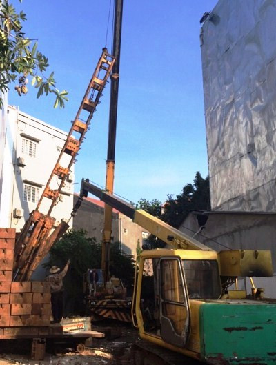 Cần cẩu đưa giàn ép cọc đè lên nóc ngân hàng ra ngoài.
