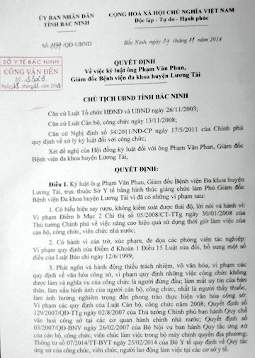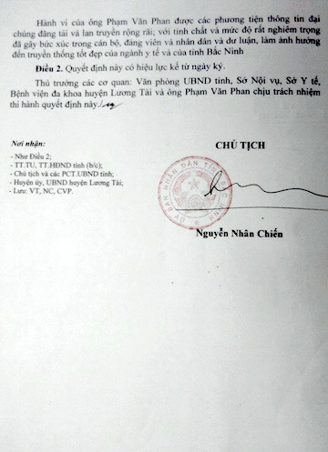 Đến ngày 14/11, chủ tịch UBND tỉnh Bắc Ninh Nguyễn Nhân Chiến đã ký quyết định 1194/QĐ-UBND về việc kỷ luật ông Phạm Văn Phan Giám đốc Bệnh viện đa khoa huyện Lương Tài. quyết định nêu rõ, kỷ luật ông Phạm Văn Phan - Giám đốc Bệnh viện đa khoa huyện Lương Tài, trực thuộc Sở y tế bằng hình thức giáng chức làm phó giám đốc Bệnh viện đa khoa huyện Lương Tài.