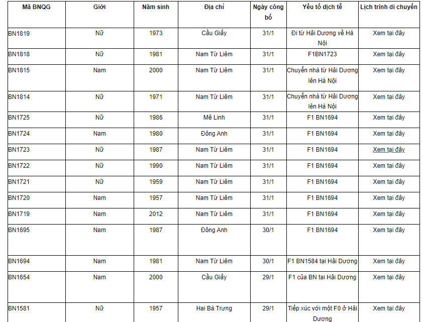Theo rà soát, ngày 23/1, bệnh nhân đi cùng gia đình 3 người đến Bạch Đằng, Chí Linh, Hải Dương. Ngày 24/1 về Hà Nội.