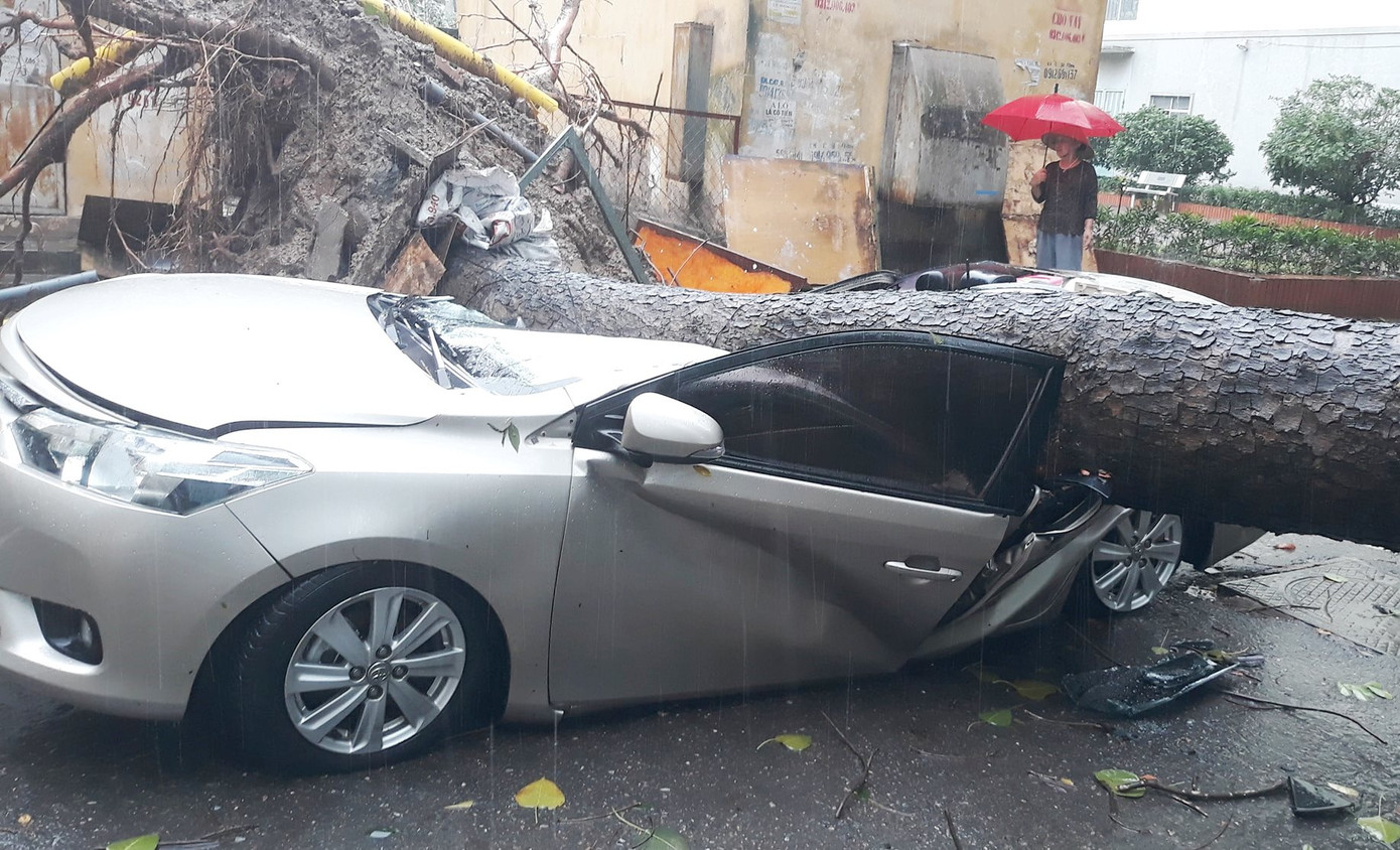 Ngoài các điểm ngập úng trên, ghi nhận của PV Tiền Phong trong chiều nay, trên tuyến đường nội bộ trong khu đô thị Định Công (Hoàng Mai), mưa và gió lớn cònlàm một cây xanh có đường kính khoảng 40cm bên đường đổ xuống, trúng và đè bẹp một ô tô nhãn hiệu Toyota Vios.