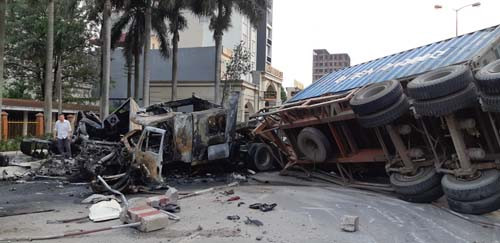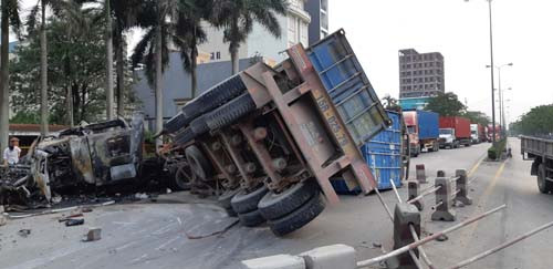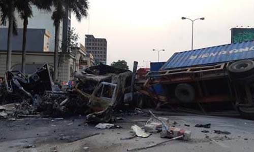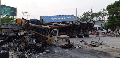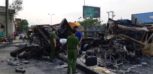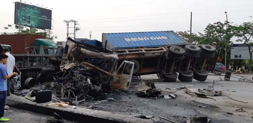 Theo ghi nhận của phóng viên tại hiện trường vụ tai nạn, 2 xe container đi từ cầu vượt Nguyễn Bỉnh Khiêm (hướng xuống Đình Vũ) đã đâm vào nhau. Cú đâm mạnh khiến một xe container cháy rụi và biến dạng hoàn toàn.